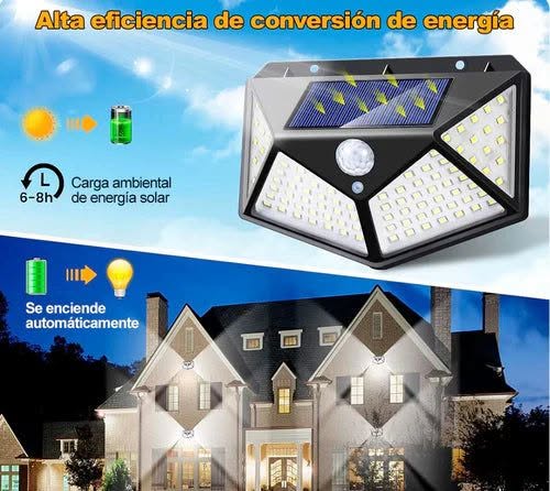 ✅ Ahorro de energía: Funciona solo con energía solar, y se carga de 6 a 8 horas. ✅ Seguridad automática: Sensor que detecta movimiento dentro de un ángulo de 120°. ✅ Instalación sencilla:Incluye soportes de montaje y tornillos. ✅ Resistente al clima: Material ABS resistente e impermeable con grado IP65. ✅ Iluminación potente: 100 LED y un ángulo de iluminación de 270°.